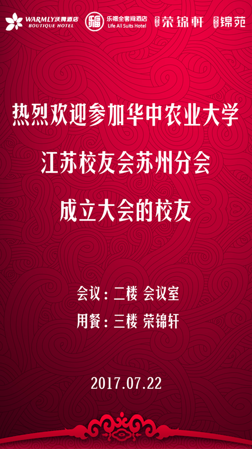 2017年7月22日,华中农业大学江苏校友会苏州分会成立大会在江苏荣锦酒店管理集团旗下沃姆酒店(苏州独墅湖高教区双湖湾店)会议室召开,并成功启动苏州校友之家。