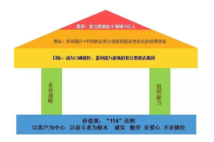在这个城堡图,明确了核心价值观的地位—荣锦企业生存和发展的基础,它确保全体荣锦人步调一致地为客户提供超高性价比的消费体验,实现“复合型酒店小领域的小巨人”这一愿景。